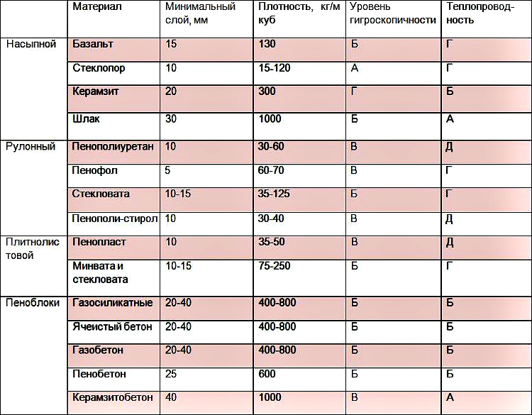 Сравнительная таблица характеристик утеплительных материалов