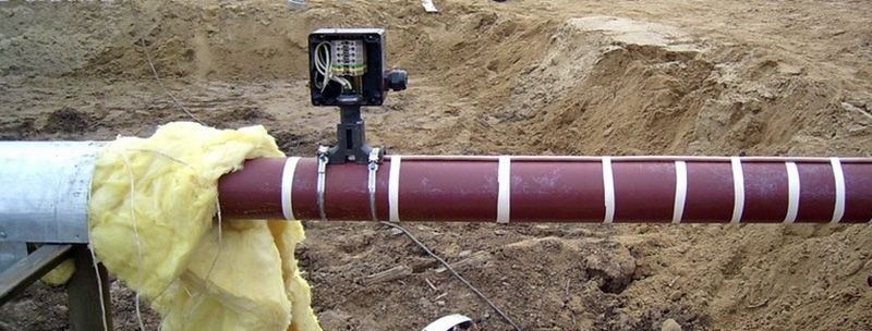 - Применение греющего кабеля полностью исключает теплоизоляционные материалы из схемы поддержания тепла вокруг магистрали. Пространство отлично прогревается кабелем мощностью 10-20 Вт/п.м. Экономичность этого способа заключается в том, что обогрев нужен только при отрицательных температурах, следовательно, в теплое время года кабель можно не включать. Использование этого прогрессивного метода позволяет не углублять трубы на требуемые стандартами 2 метра – трубопровод можно закладывать только на 0,5 м.