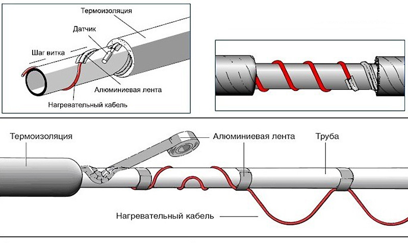 Снаружи греющий кабель можно проложить и закрепить продольно или по спирали. Существуют специальные расчеты, благодаря которым вычисляется расстояние между витками провода и общее количество витков.