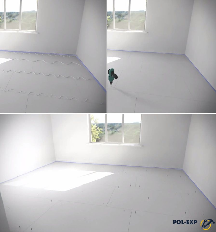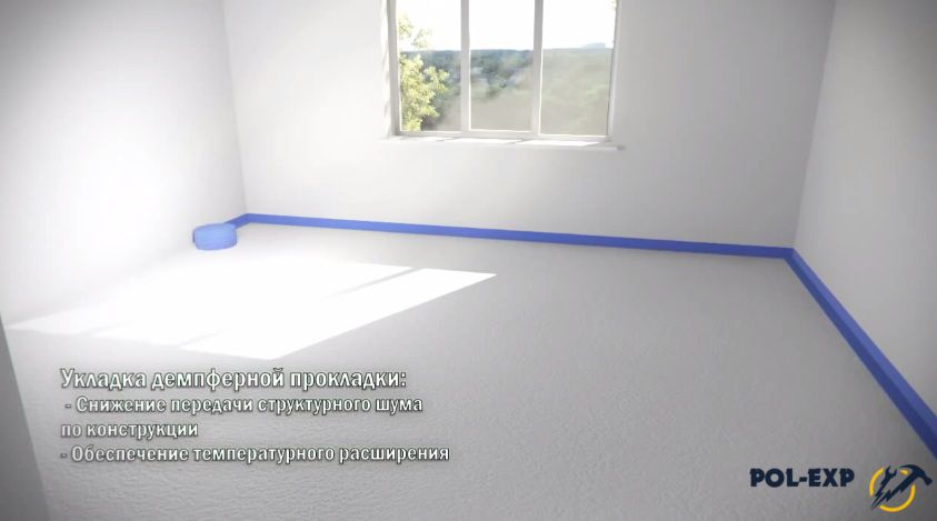 Шаг 1. Бетонный пол тщательно очищают от пыли и мусора. По периметру помещения наклеивают демпферную ленту.