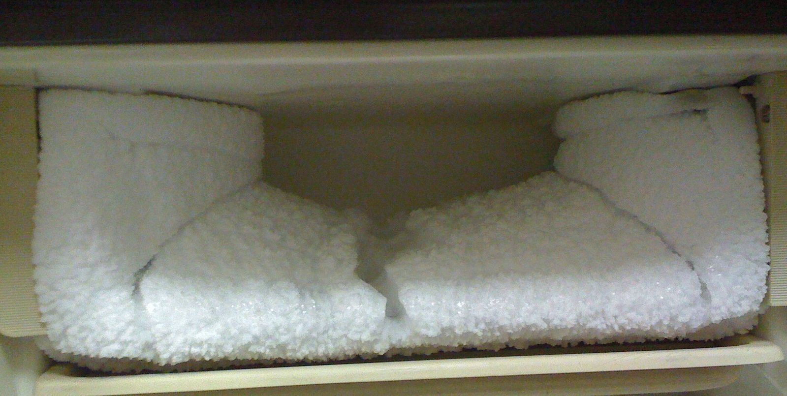 Для этой проблемы характерны скопление снега и наледи снизу. При нормальном функционировании системы «Ноу Фрост» камеры не реже раза в сутки очищаются ото льда. Происходит это следующим образом: чтобы превратить лёд в воду, подключается ТЭН. Образовавшаяся вода стекает по дренажной системе. Но если дренажная дырочка забилась, воде некуда деваться. Она так и остается под ящиками, намерзая толстыми глыбами льда.