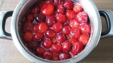 - Чтобы сохранилась целостность кусочков, алычу выкладывают в горячий сироп и выстаивают 4-6 часов. Если варенье варится из красной алычи, ее сразу можно выкладывать в горячий сироп и варить дальше.