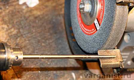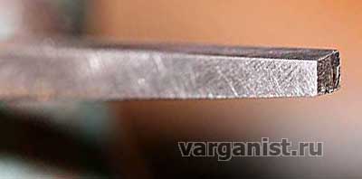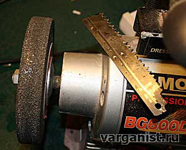 Также на электроточиле обрабатываем вторую сторону язычка. Оде стороны должны быть остро заточены, как нож. Заточка проводится как с одной, верхней стороны, так и с двух сторон (на фото показан промежуточный результат).