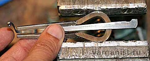 Загнул колено и колечко язычка, делать это лучше маленькими круглогубцами прямо в пламени, нагрев предварительно сталь докрасна только в месте гиба!