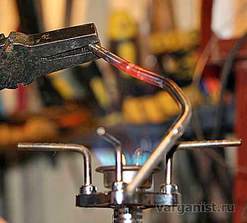 Загиб с малым радиусом делаю ковкой, предварительно нагрев металл докрасна, на газовой плитке.