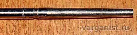 С помощью напильника и надфиля придал правильную форму.С помощью фетрового круга и пасты ГОИ отполировал деку и язычок.Осталосьсамое сложное — установить язычок, обеспечив маленький и равномерныйзазор с декой. Сначала вбил его на конус, как показано на фото. В этотмомент происходит регулировка, если язык ушел на одну сторону его можнопоправить, ударяя по этой же стороне хвостовика. Если зазор велик,продолжаю забивать его по центру хвостовика. В этот счастливый моментуже можно пробовать играть, добиваясь яркого звука, но отсутствия стукаоб деку. Далее края паза завальцовываем молотком (слегка) и обрезаемлишний край.
