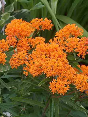 Ваточник туберозовый – невысокое растение. У него цветки ярко-оранжевые. Этот цветок лучше всего высаживать к растениям, где много зелени. Такие композиции особенно привлекают внимание. Зонтики ваточника до поздней осени своими крупными размерами украшают сад.