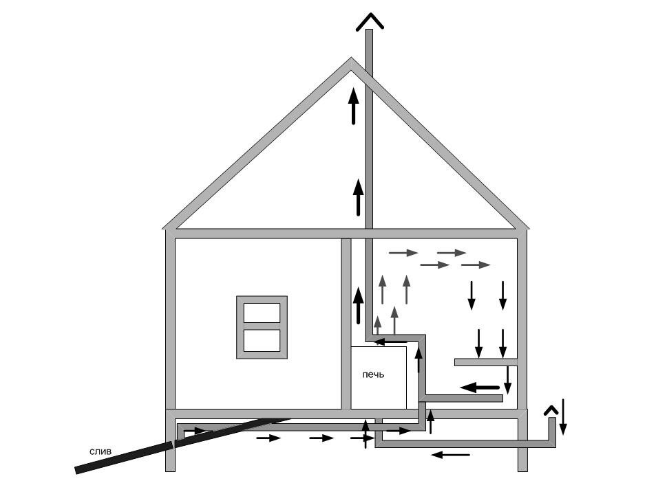 Еще один тип предусматривает непрерывно действующую печь, поддувальное отверстие которой заменяет вытяжку. Для притока делают окно под полкой, противоположной самой печи и на том же уровне. Холодный воздух вытесняет нагретую массу вверх, а когда отдавшие тепло части потока опускаются, они уходят в поддувальный канал. Есть и еще более сложные системы, когда размещается пара приточных и пара выходных вентиляционных окон (обязательно с принудительным типом циркуляции). Отрегулировать усложненные комплексы довольно сложно, но их эффективность выше, чем в простейших случаях.