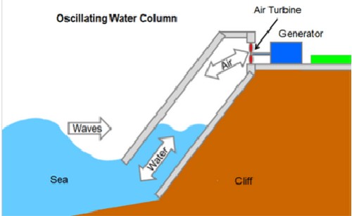 Принцип работы волновой электростанции заключается в том, что проходящие через нее волны толчками заполняют водой специальную камеру, вытесняя содержащийся в этой камере воздух. Сжатый воздух под давлением проходит через турбину, вращая ее лопасти. В результате вырабатывается электричество.