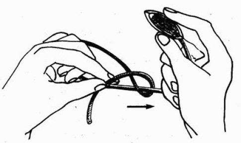 - Игла проводится через колечко, инструмент движется в направлении снизу-вверх.