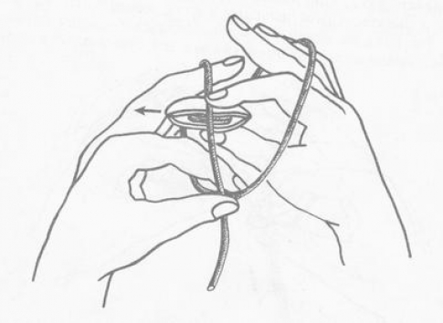 Вначале следует обвить нитью левую руку, двигаясь по часовой стрелке, при этом кончик нитки зажимают между пальцами (большим и указательным). Теперь вы набрасываете ведущую нить (направляется от инструмента) на свою правую руку, а инструмент, заключенный меж двух пальцев, проводите под рабочей нитью (она находится на левой руке).