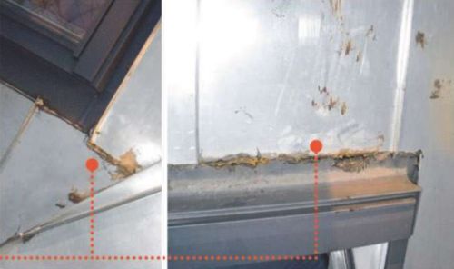 Мансардное окно встроено в фальцевую кровлю. При этом не обеспечено надёжное и герметичное примыкание оконного блока к кровельному покрытию. Стыки наружного оклада и листовой стали заполнены герметиком и скреплены кляммерами (должны быть под кровлей), прибитыми обычными гвоздями (сквозное повреждение покрытия).