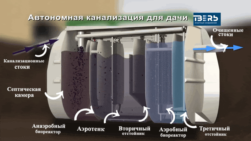 В самом начале вся жидкость попадает в отдельный резервуар, где находится септик. Резервуар чаще всего представляет собой обычную полиэтиленовую емкость, где встроен впускной трубопровод, дефлектор и смотровое окно или люк, а на выходе устроен специальный фильтр с фильтрационным материалом. В процессе работы все тяжелые частицы оседают на дне, где их ожидает медленный процесс брожения, в конечном результате, одна часть выходит на дно септика, а другая попадает в загрязненный раствор.