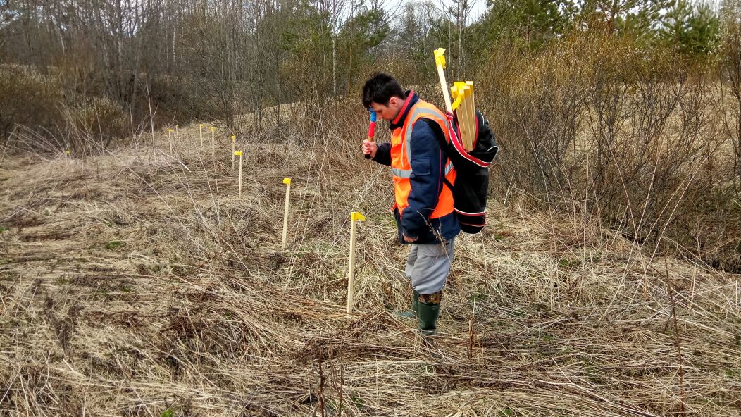 - Определение и закрепление границ: На основе полученных координат на местности определяются поворотные точки границ участка и закрепляются межевыми знаками (колья, столбы, арматура).