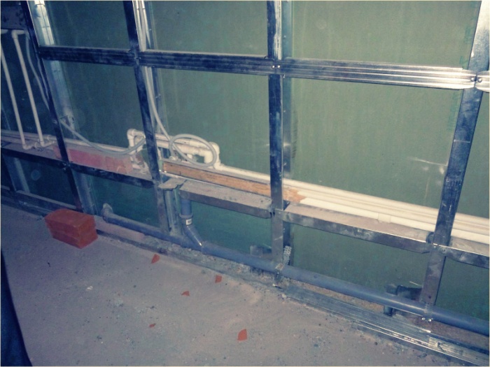 - Сокрытие инженерных систем в ванной.При установке гипсокартона на каркас образуется фальш-стена, под которой можно проложить любое количество водопроводных и канализационных труб, электрических кабелей и воздушных каналов. В случае с клеевым способом пришлось бы дополнительно штробить стены.