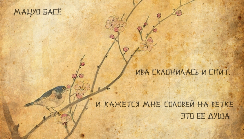 Автор этого лаконичного стихотворения — Басе. Несмотря на емкость трехстишия, читатель должен подключить воображение и частично принять участие в творческой работе японского поэта. Следующее хокку также написано Басе. В нем поэт изображает беззаботную жизнь маленькой птички: