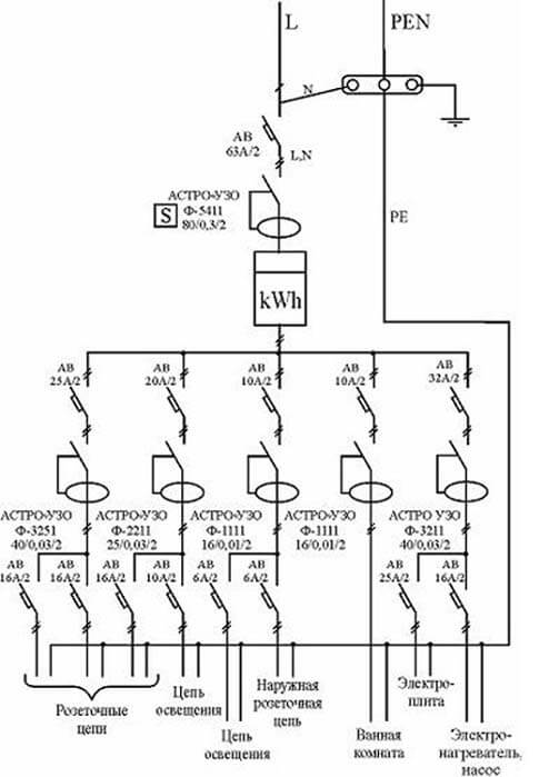 - Если вышло, что для общей защиты нужно «пожарное» УЗО на 100 мА, определить, сколько, где и каких требуется вторичных «жизненных» УЗО на 30 мА.