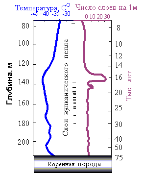 В ледяном керне обнаружены слои вулканического пепла. Графики показывают, что после интенсивной вулканической деятельности начался конец оледенения.