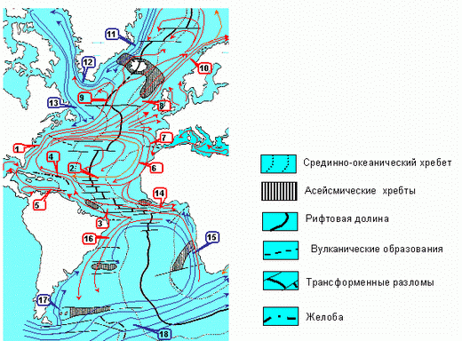 1- Гольфстрим, 2 и 3 — экваториальные течения(Северное и Южное Пассатные течения),4 — Антильское, 5 — Карибское, 6 — Канарское, 7 — Португальское, 8 — Северо-Атдантическое, 9 — Ирмингера, 10 — Норвежское, 11 — Восточно-Гренландское, 12 — Западно-Гренландское, 13 — Лабрадорское, 14 — Гвинейское, 15 — Бенгельское, 16 — Бразильское, 17 — Фолклендское, 18 -Антарктическое циркумполярное течение (АЦП)