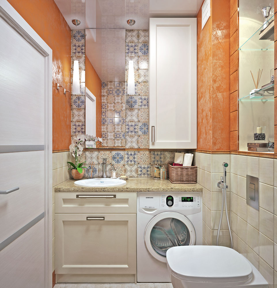 В этом помещении дизайнер предлагает поменять местами унитаз и раковину. За счёт, казалось бы, незначительной «рокировки» в санузле появится место для стиральной машины, ну а над навесным унитазом со скрытым бачком удастся сделать нишу с полками для банных принадлежностей.